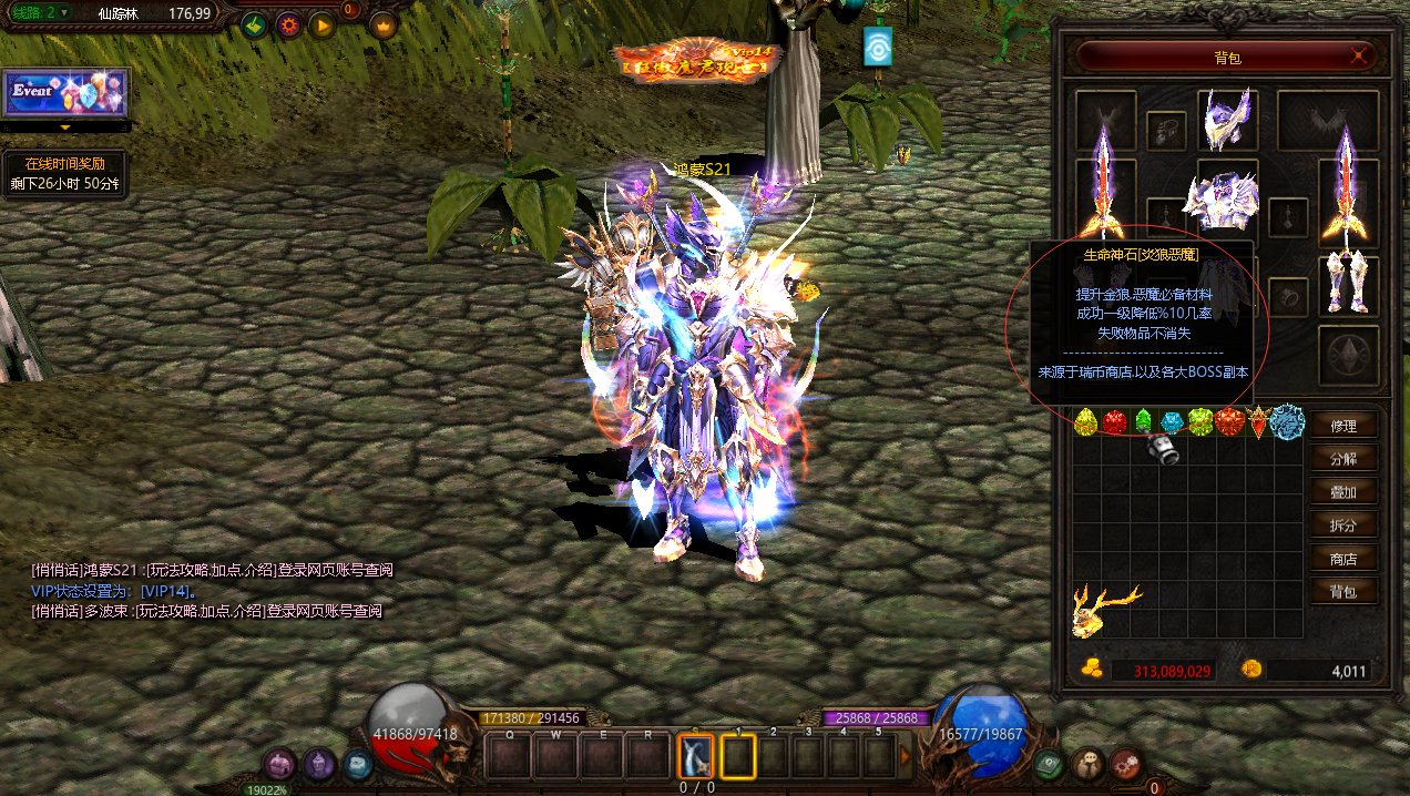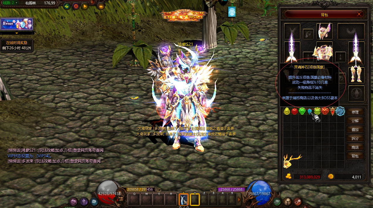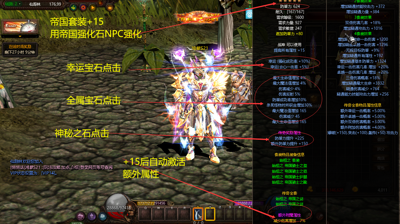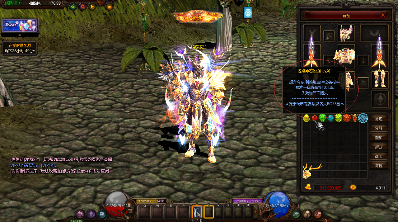 | VIP14 | 1000000元宝 | 经验/血量/攻击/防御/SD值/伤害减少/提升14% | 仙踪林合成+15成功率+90% | ![]() |