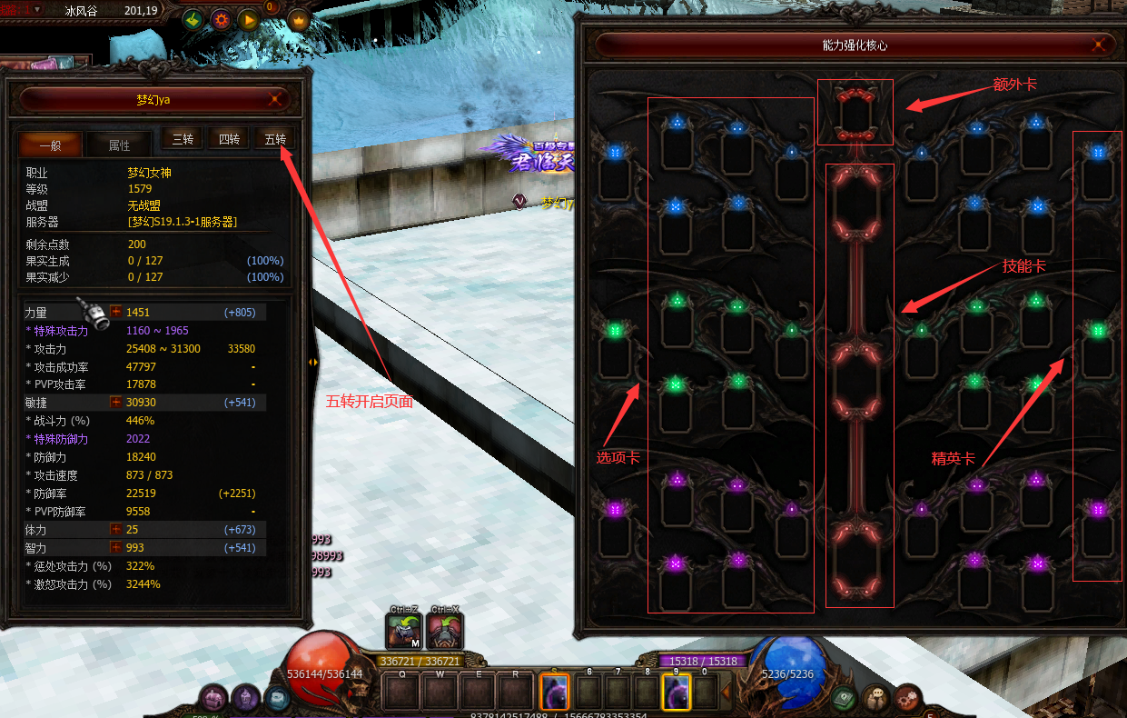 第五次转职能量核芯说明 1当角色完成第五次转职3项试练任务后,可以通过[能量核芯]进一步强化角色 2可以通过角色属性界面开启[能量核芯]的UI界面,或者可以使用快捷键[Ctrl + J]开启界面 3可以通过能量核芯的界面查看能量核芯的[卡槽]数量以及类型 4当角色完成第五次转职任务,会自动获得[额外卡槽] 5同时除[额外卡槽]外,还分为[技能卡槽]/[选项卡槽]以及[(精英)选项卡槽]多种类型卡槽 |